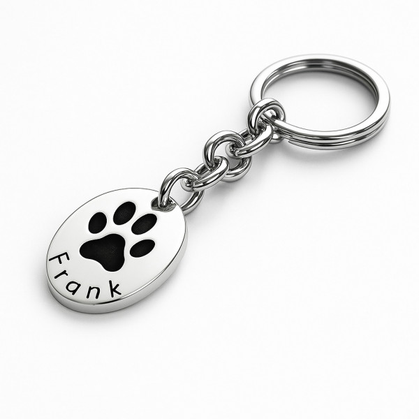 A wonderful pawprint keyring made from solid silver and is avaliable in heart, circle or oval shapes. Approximate size is 20mm depending on the style you select. A name on the front of the keyring is included. A special date or age can be added to the reverse side, maximum of 15 Characters (extra £20.00).