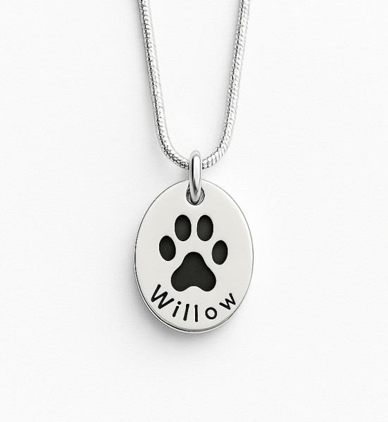 Our pawprint pendants are made from solid silver and are avaliable in heart, circle or oval shapes. A name on the front of the pendant is included, A special date or age can be added to the reverse side, maximum of 15 Characters (extra £20.00).Please note that the pendant does not include a chain, you can order a chain further down the page.